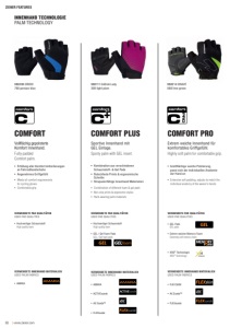 INNENHAND TECHNOLOGIE PALM TECHNOLOGY COMFORT Vollflächig gepolsterte Komfort Innenhand. Fully padded Comfort palm. • Erfüllung aller Komfort Anforderungen an Fahrradhandschuhe • Angenehmes Griffgefühl • Meets all comfort requirements for cycling gloves • Comfortable grip VERWENDETE PAD QUALITÄTEN USED PAD QUALITIES • Hochwertiger Schaumstoff High quality foam VERWENDETE INNENHAND MATERIALIEN USED PALM FABRICS • AMARA COMFORT PLUS Sportive Innenhand mit GEL Einlage. Sporty palm with GEL insert. • Kombination aus verschiedenen Schaumstoff- & Gel Pads • Rutschfeste Prints & ergonomische Schnitte • Strapazierfähige Innenhand Materialien • Combination of different foam & gel pads • Non-slip prints & ergonomic styles • Hard-wearing palm materials VERWENDETE PAD QUALITÄTEN USED PAD QUALITIES • Hochwertiger Schaumstoff High quality foam • GEL / Gel Foam Pads GEL / Gel foam pads VERWENDETE INNENHAND MATERIALIEN USED PALM FABRICS • AMARA • ACTIVEsuede • AX Suede™ • FLEXsuede COMFORT PRO Extrem weiche Innenhand für komfortables Griffgefühl. Highly soft palm for comfortable grip. • Großflächige weiche Polsterung, passt sich der individuellen Anatomie der Hand an • Extensive soft padding, adjusts to match the individual anatomy of the wearer’s hands VERWENDETE PAD QUALITÄTEN USED PAD QUALITIES • GEL Pads GEL pads • Extrem weicher Memory Foam Extremely soft memory foam • XRD® Technologie XRD® Technology VERWENDETE INNENHAND MATERIALIEN USED PALM FABRICS • FLEX SKIN • AX Suede™ • FLEXsuede 988206 CRIDO 798 persian blue 988111 CADJA Lady 300 light plum 988214 CRAVE 568 lime green ZIENER FEATURES 60