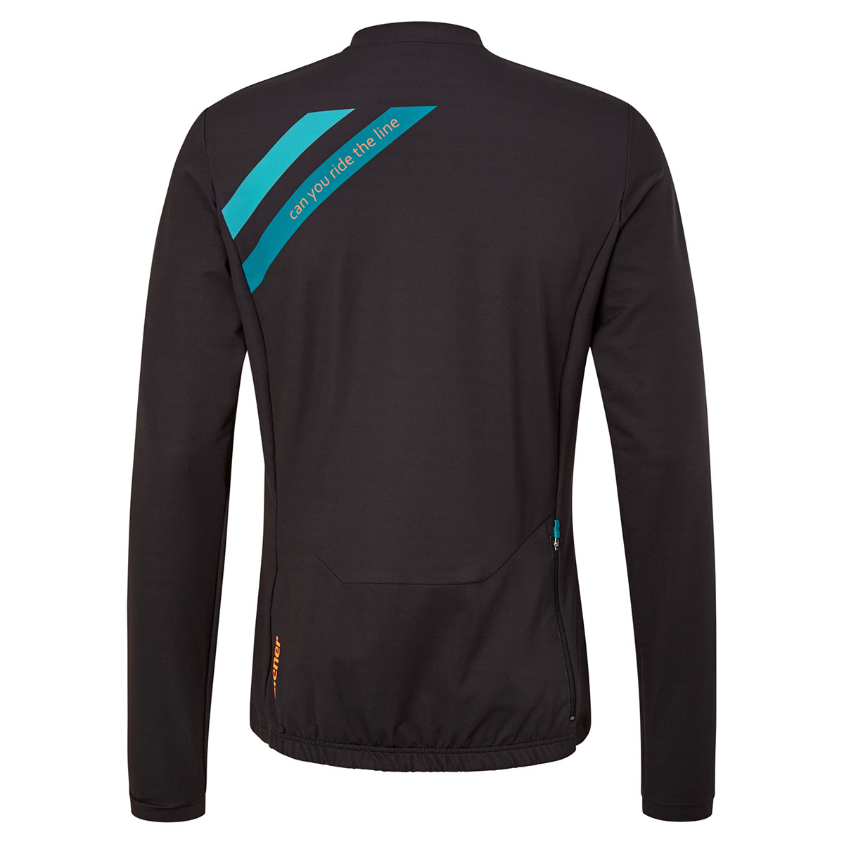 The functional ZIENER long-sleeved jersey NITAN for men with full front zipper and stand-up collar guarantees optimum wearing comfort thanks to its quick-drying and stretchy material. The zipped pocket with water-repellent pouch can be used to hold essential items – so everything stays dry, whatever the weather. The silicone coating on the hem provides perfect grip on the back. The stylish print on the chest is a real eye-catcher. Made in Europe.
