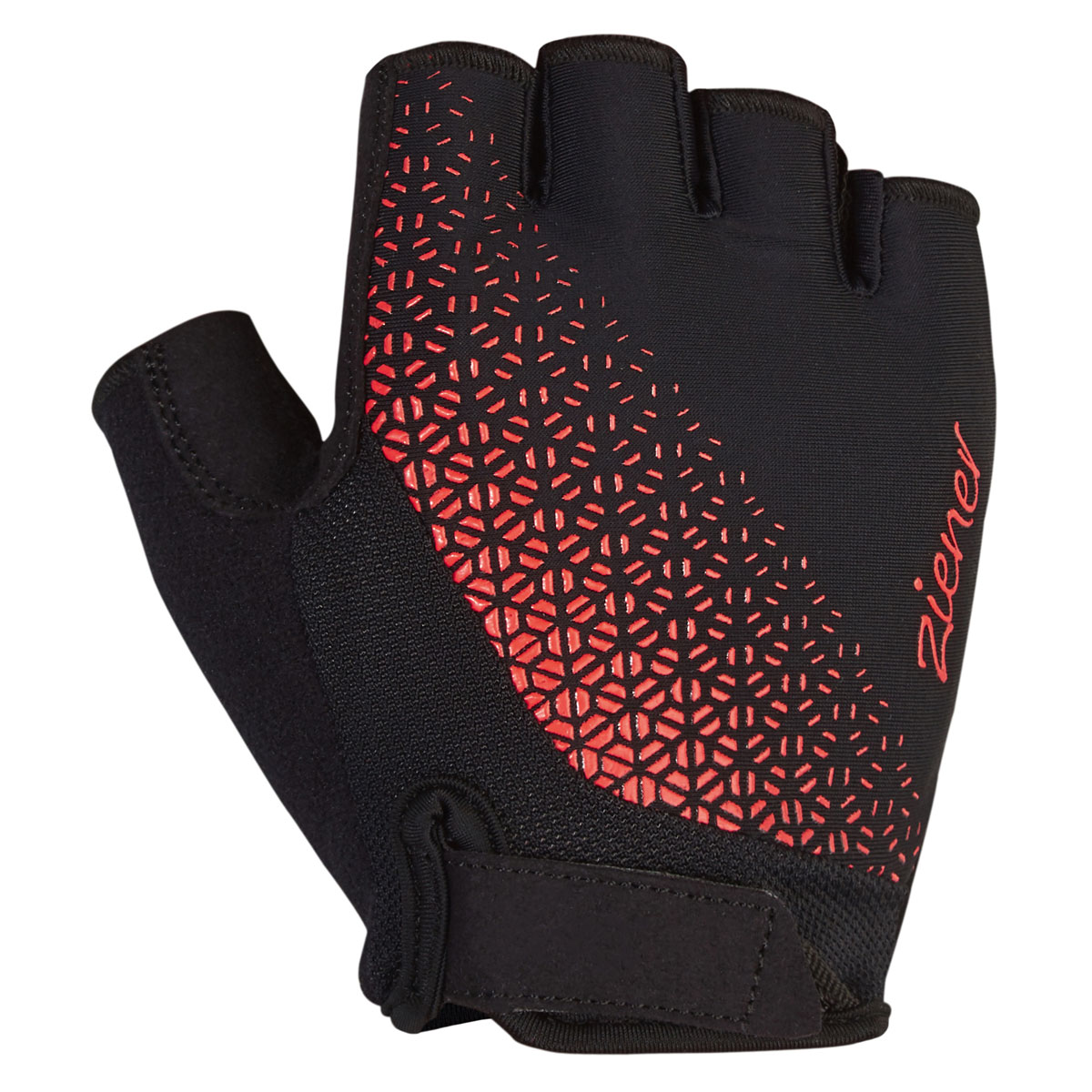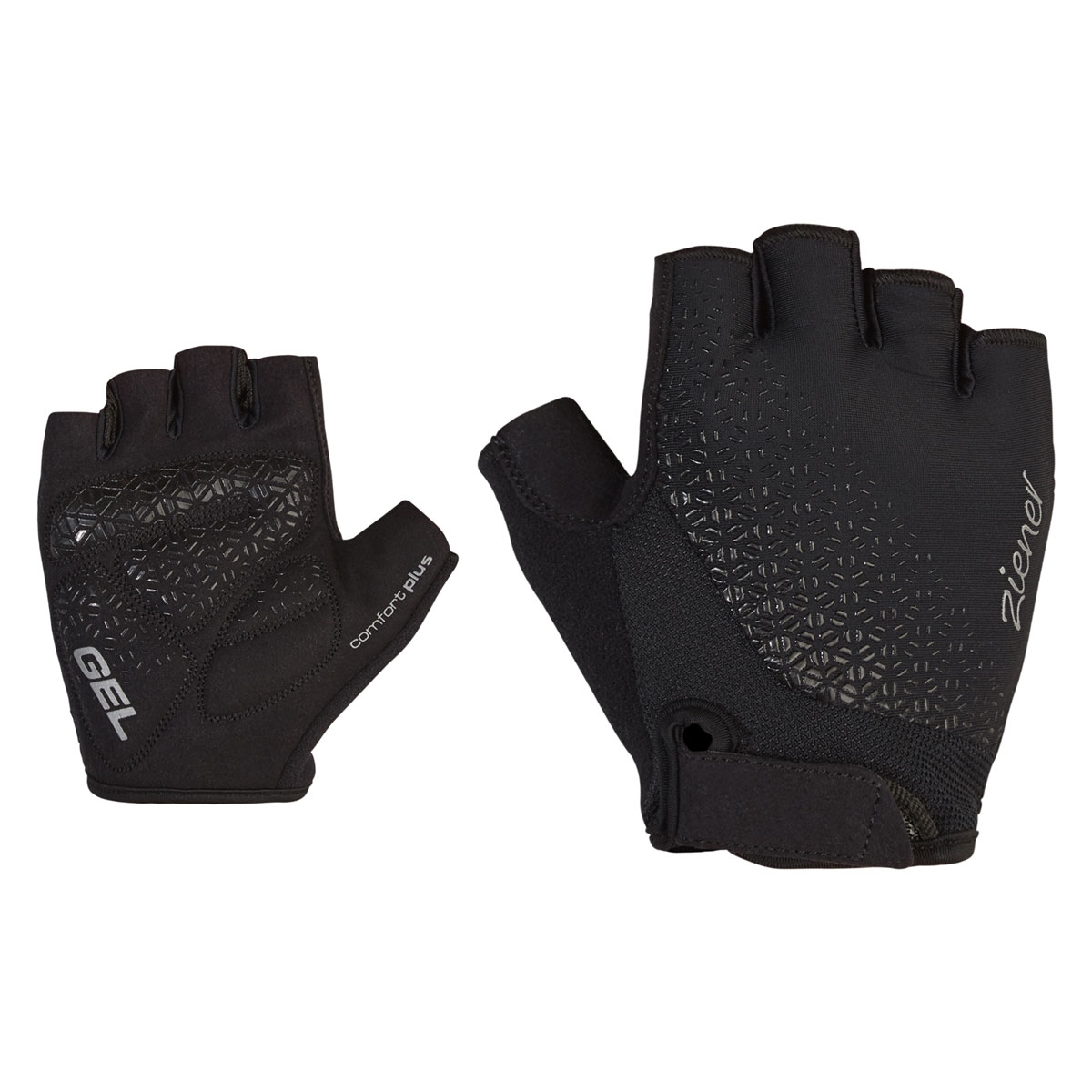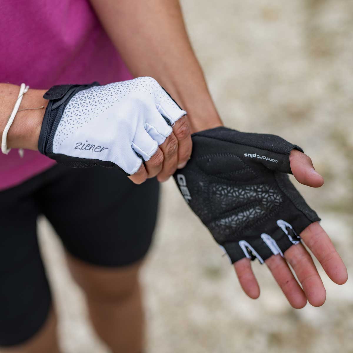 The ZIENER women's short-finger cycling gloves CADJA LADY are equipped with integrated pull-off aids for quick and easy removal of the gloves. The specially tailored thumb patch prevents pressure points on the skin and the use of highly absorbent material on the thumb makes it easier to wipe away sweat. Special gel padding on the palm provides maximum comfort on the handlebars. The durable, breathable leather-like palm material provides an all-around good feeling. The Velcro closure with edge around the sharp Velcro closure prevents wear and tear on the material and increases user comfort when taking the glove off.