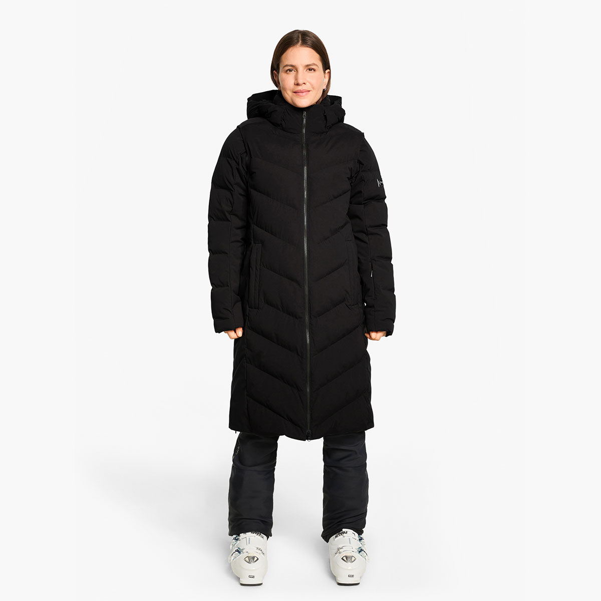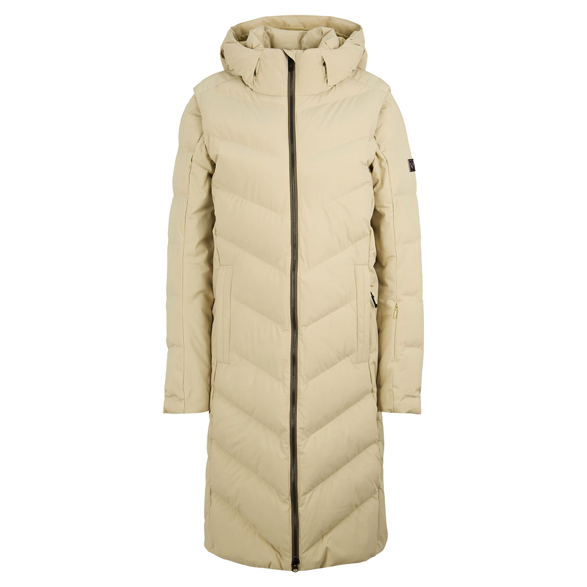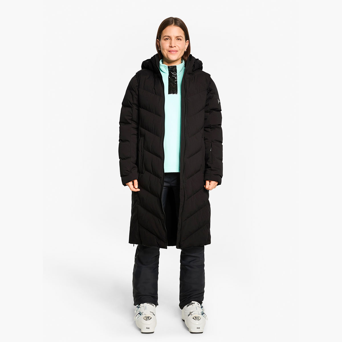 The long, fashionable ZIENER women's coat TELSE-Z LADY is characterized by the washable, environmentally friendly MicroDown. This ensures outstanding thermal performance. The breathable, waterproof and windproof ZIENER AQUASHIELD® membrane (water column 10,000mm/breathability 10,000g/m²/24h) provides a warm and dry climate. The waterproofing of the coat is PFAS-free. The outer fabric is bluesign® certified. The sleeves can be removed - so the coat can also be worn as a stylish, long vest in transitional seasons. The coat also has a short zipper at the waist for individual slit openings. Elasticated inner sleeve cuffs and an elasticated lining offer optimum freedom of movement. A ski pass pocket on the sleeve makes this coat the perfect companion for cold winter days on and off the slopes. An inside pocket for ski goggles and sunglasses as well as a pocket for smartphones provide space for the most important things.