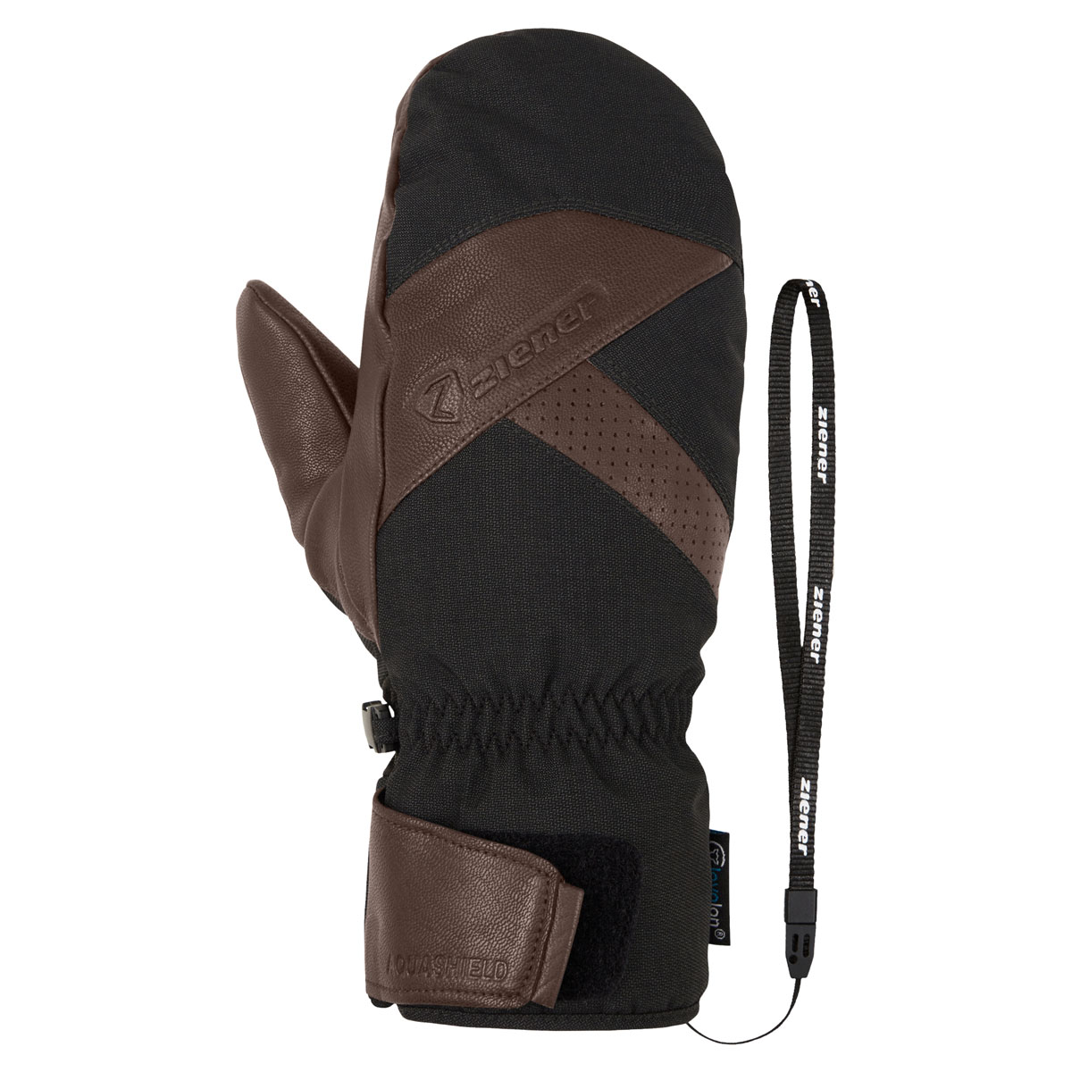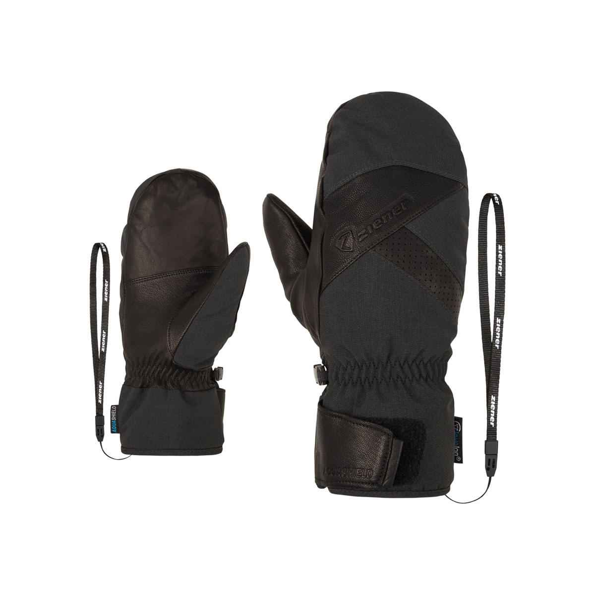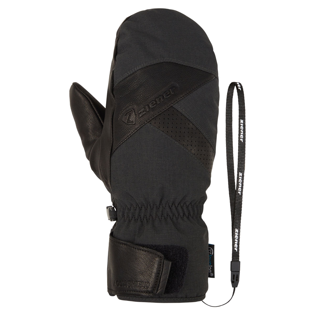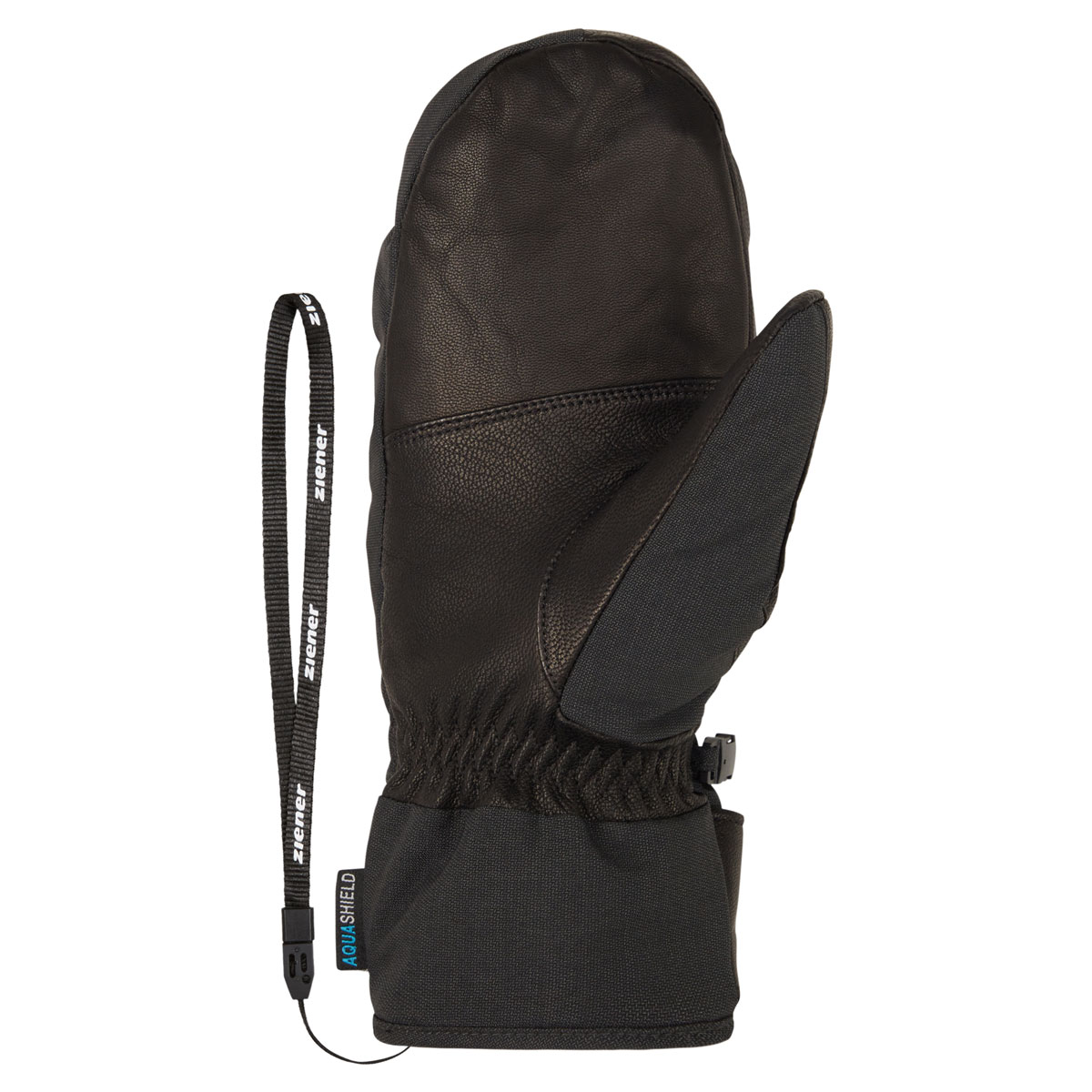 The modern, sporty ZIENER men's ski mittens GETTERO-Z AS® AW MITTEN are equipped with the waterproof and windproof ZIENER AQUASHIELD® membrane. The warm lavalan® wool padding keeps the body temperature in the comfort zone even on cold days and guarantees optimum climate comfort. The soft kid leather palm is both tactile and robust. The 5-finger lining guarantees an optimum, tactile grip on the ski pole. Backhand materials made from modern textured fabric offer style on the slopes. The wide Velcro strap also allows the gloves to be worn under a jacket. The practical Z-leash secures the glove to the wrist, even when quickly removed. The product contains non-textile parts of animal origin. The outer fabric is bluesign® and Standard 100 by OEKO-TEX® certified.