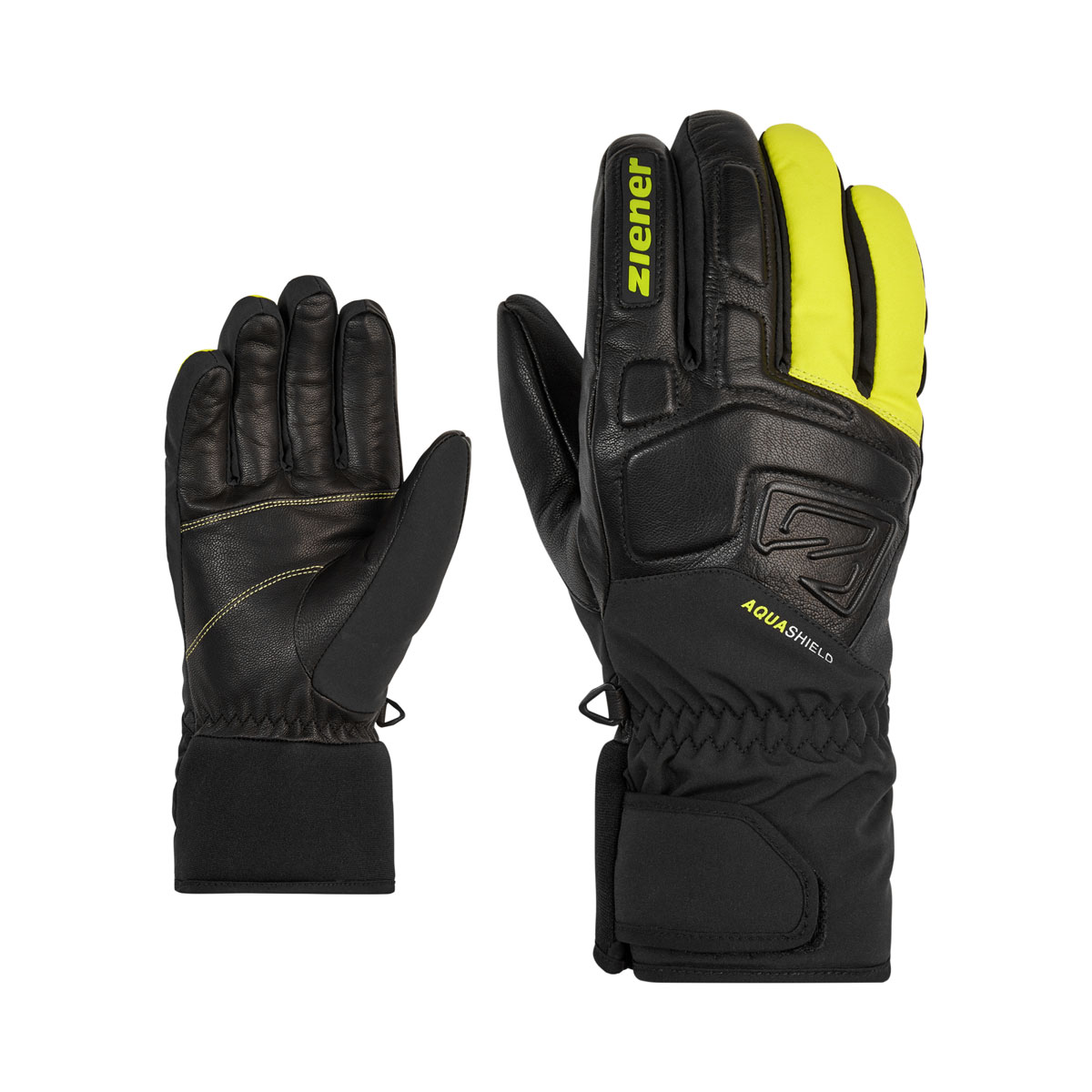 The high-quality, modern ZIENER men's ski gloves GLYXUS AS® are equipped with the waterproof and windproof ZIENER AQUASHIELD® membrane, which ensures a warm and dry climate. A combination of stretch materials and leather inserts in the backhand ensure particular robustness and flexibility. The grippy goat leather palm provides optimum power transmission and grip on the ski pole. The neoprene cuff on the wrist and the wide Velcro strap allow the glove to be worn under a jacket. The product contains non-textile parts of animal origin. The outer fabric is bluesign® and Standard 100 by OEKO-TEX® certified.