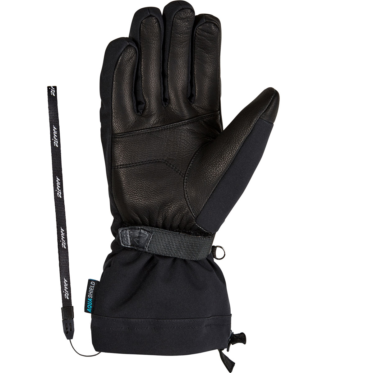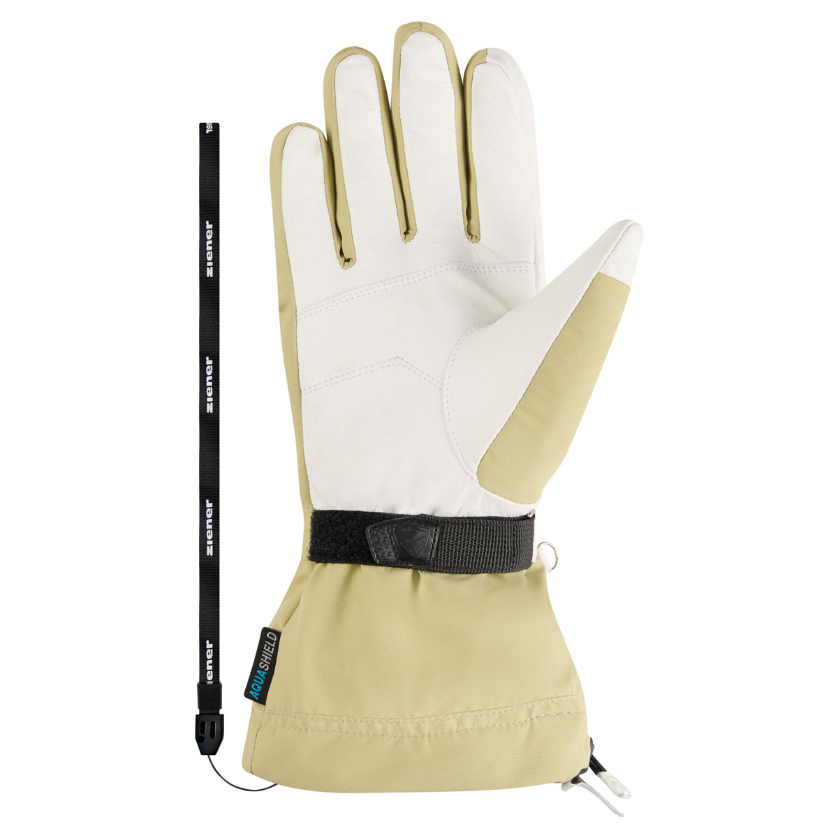 The sporty, functional, freeride-oriented ZIENER women's ski gloves KILATANA-Z AS® AW LADY are equipped with the waterproof and windproof ZIENER AQUASHIELD® membrane, which ensures a warm and dry climate. Thanks to the use of extra warm and elastic materials, as well as warm and soft lavalan® wool padding, the gloves are pleasant and comfortable to wear - even in adverse weather conditions. The soft leather palm provides optimum grip. The long cuff prevents snow from getting in. The cordlock system makes it easy to fasten the glove cuff over the jacket sleeve with just one hand. The practical leash reliably secures the glove to the wrist, even when quickly removed. The product contains non-textile parts of animal origin. The outer fabric is bluesign® and Standard 100 by OEKO-TEX® certified.