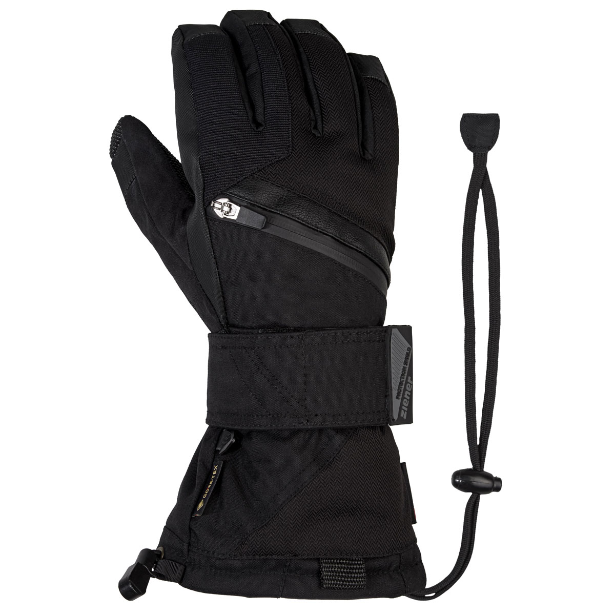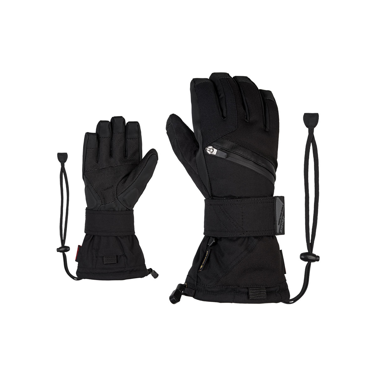 The robust, sporty ZIENER snowboard gloves MARE-Z GTX + GORE PLUS WARM are equipped with the new GORE-TEX ePE membrane and are therefore permanently waterproof, windproof and breathable. The innovative ePE membrane is PFAS-free and also bluesign® and Standard 100 by OEKO-TEX® certified. The GORE-TEX PLUS WARM technology guarantees extra warmth and maximum comfort. Ergonomically pre-shaped, removable wrist protectors on the palm ensure a comfortable fit. They are secured with a particularly wide all-round Velcro fastener and the Cordlock system, which can be tightened with just one hand. Robust palm padding and fingertip reinforcements ensure that no edge cuts occur when wearing the board. The palm is also made of particularly robust, cut-resistant Super Fabric® material. There is a waterproof zippered pocket on the backhand. The leash additionally secures the glove to the wrist.