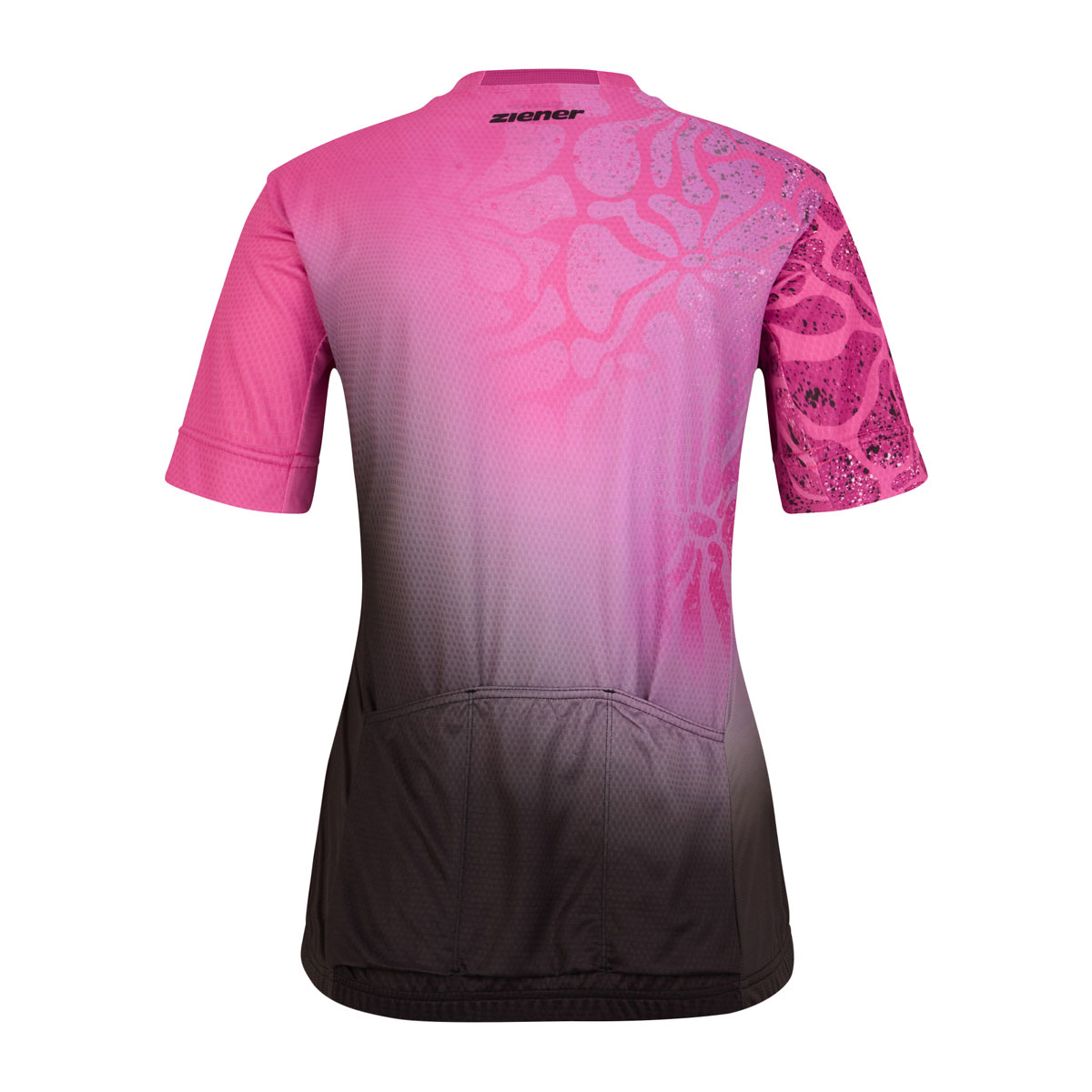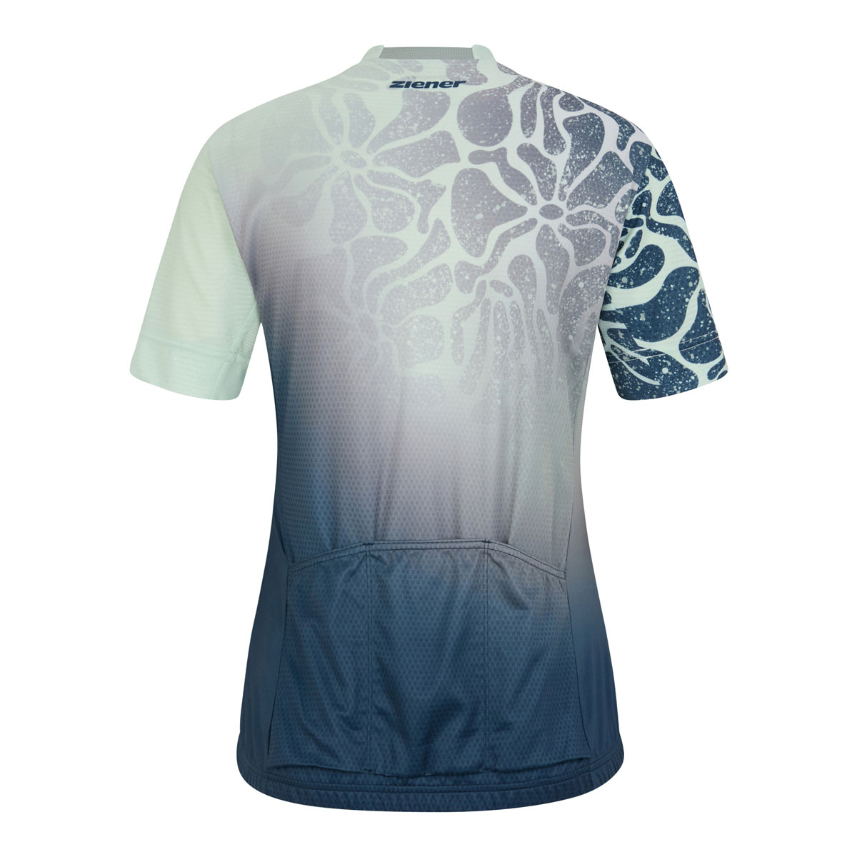 Das funktionelle ZIENER Damen Fahrradtrikot NELENIA LADY mit halbem Front-Reißverschluss besitzt Mesh-Einsätze an den Seiten und unter den Ärmeln für optimale Belüftung. Die Silikonbeschichtung am Saum sorgt für perfekten Halt und der schnelltrocknende, elastische Stoff mit zusätzlich elastischen Nähten bieten höchste Performance. Die 3er Rückentasche bietet genügend Platz für persönliche Utensilien. Der modische Allover-Sublimationsdruck sorgt für Style auf dem Bike.