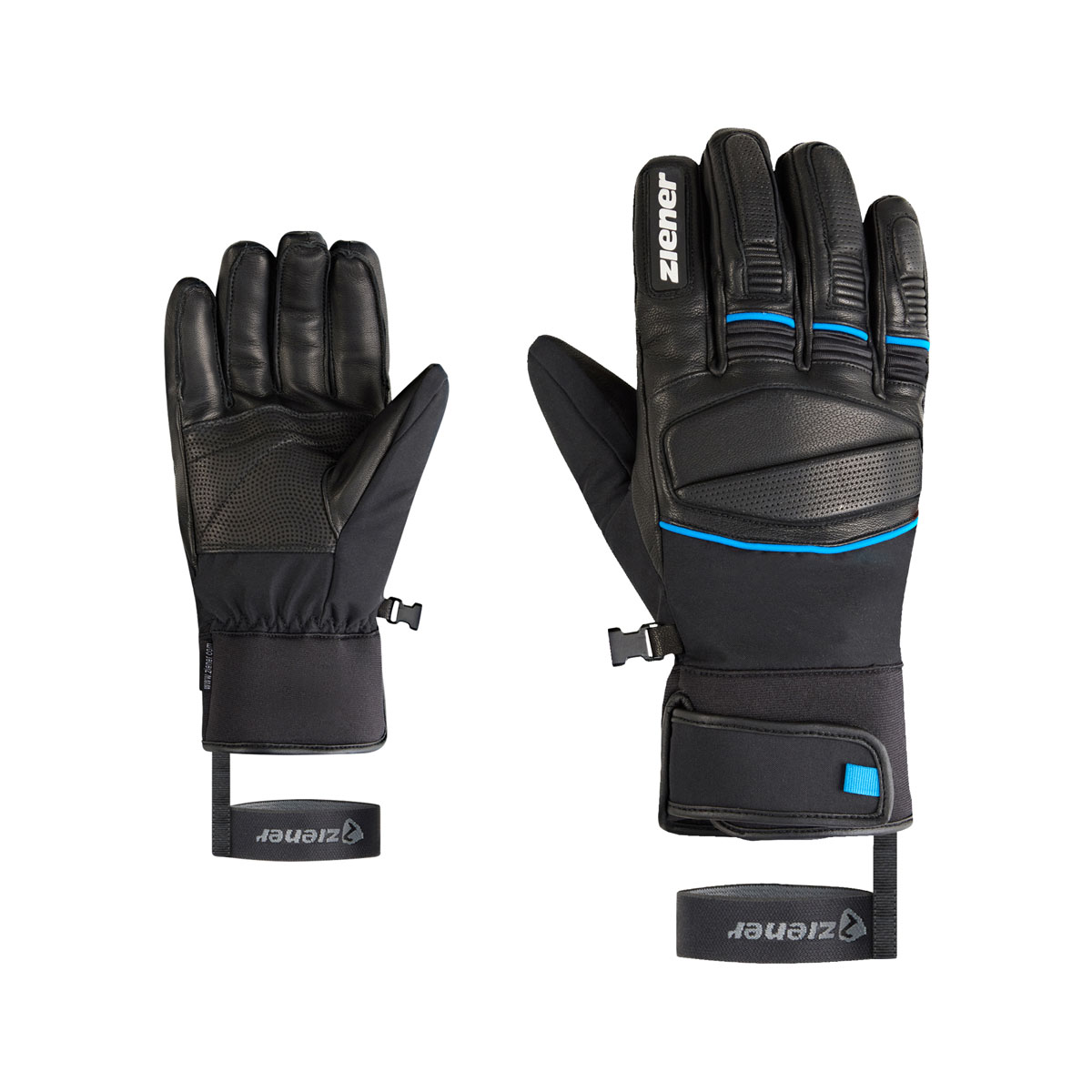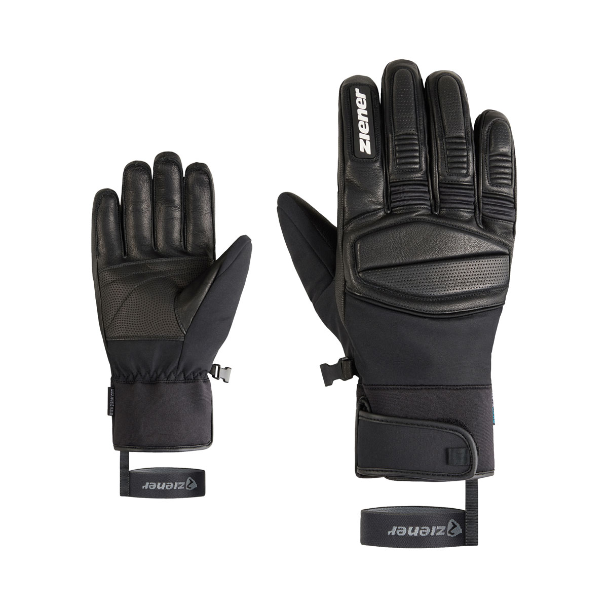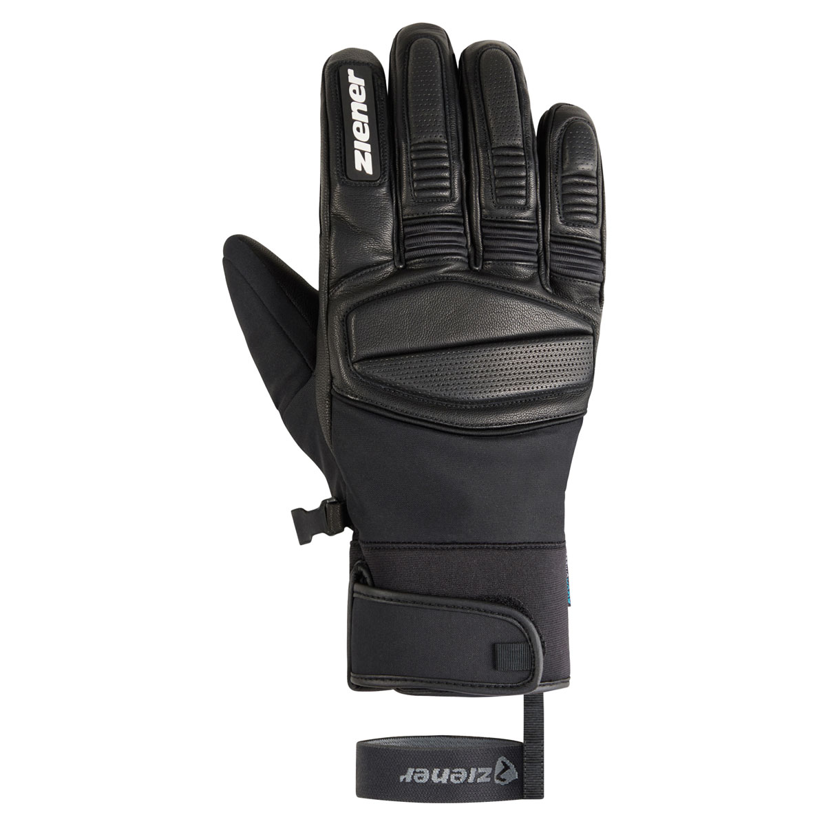 Die sehr sportlichen Ziener Herrenskihandschuhe GOZIM-Z AS® sind mit einer atmungsaktiven, sowie wasser- und winddichten ZIENER AQUASHIELD® Membran ausgestattet. Die griffige Leder Innenhand sorgt für eine perfekte Kraftübertragung am Skistock. Die Fingerknöchnel sind mit einer leichten Polsterung versehen. Das Neoprenbündchen mit Klettverschluß am Handgelenk schließt eng ab, so dass der Handschuh bequem unter dem Jackenärmel getragen werden kann.Die praktische Leash fixiert den Handschuh auch bei schnellem Ausziehen zuverlässig am Handgelenk. Das Produkt enthält nichttextile Teile tierischen Ursprungs. Der Außenstoff ist bluesign® und Standard 100 by OEKO-TEX® zertifiziert.