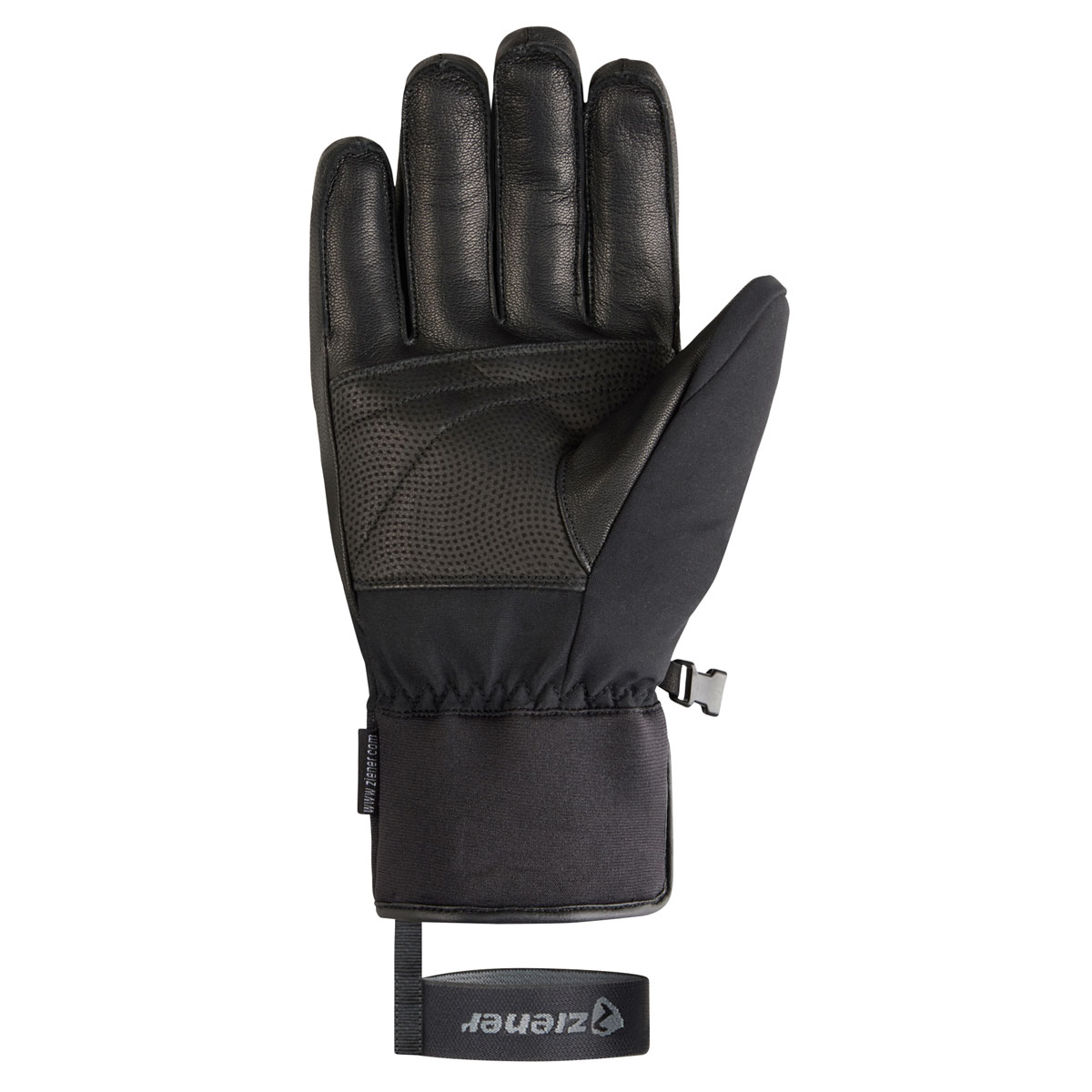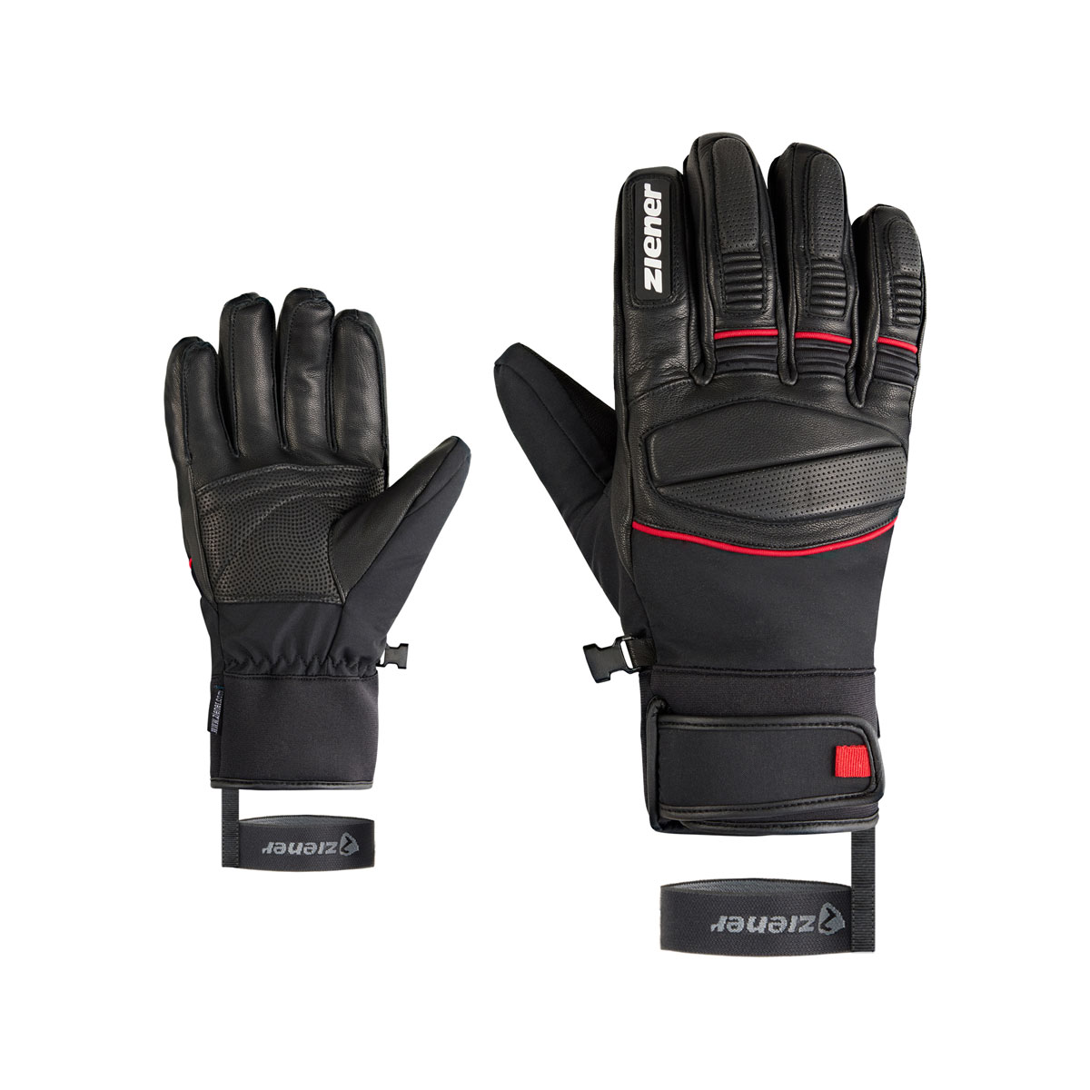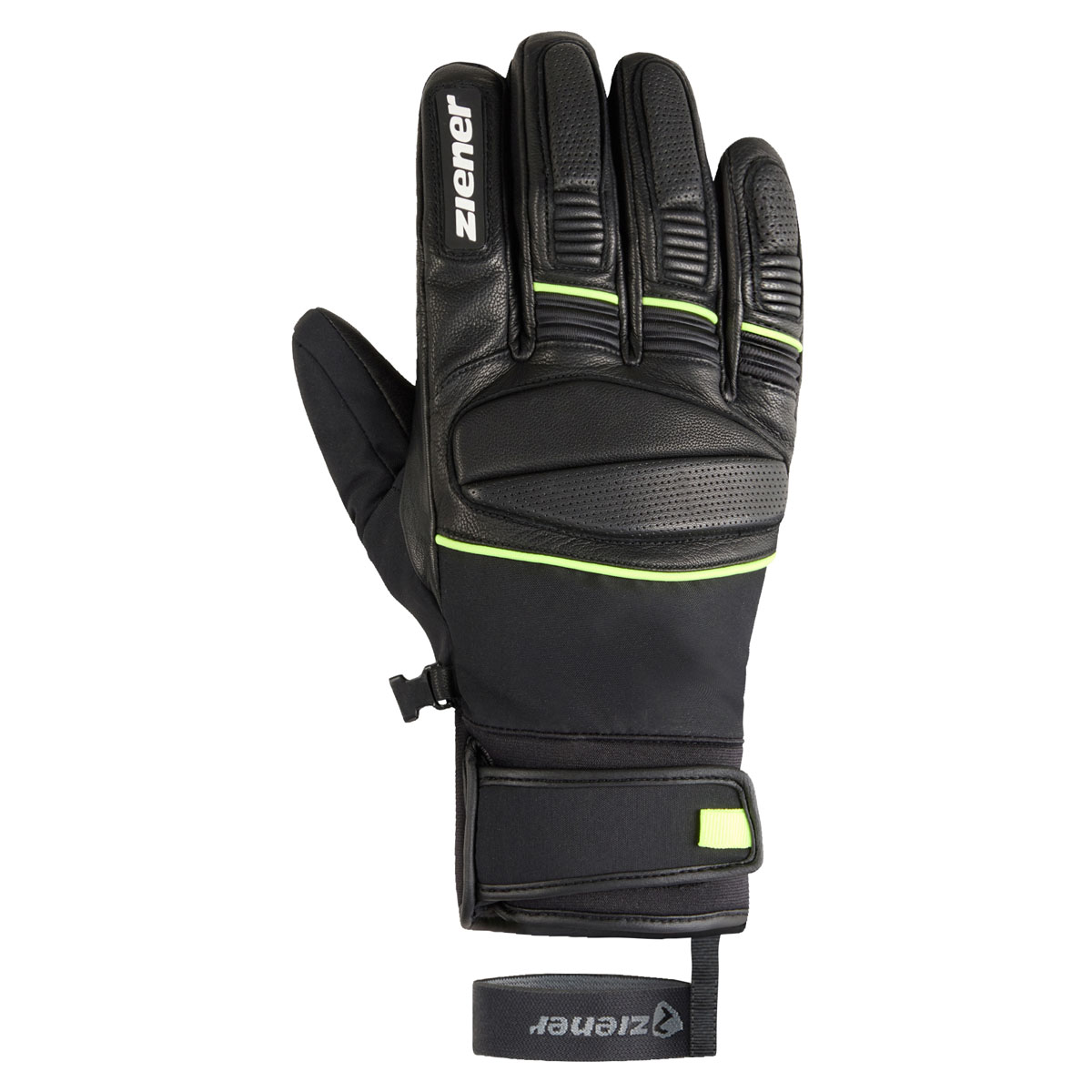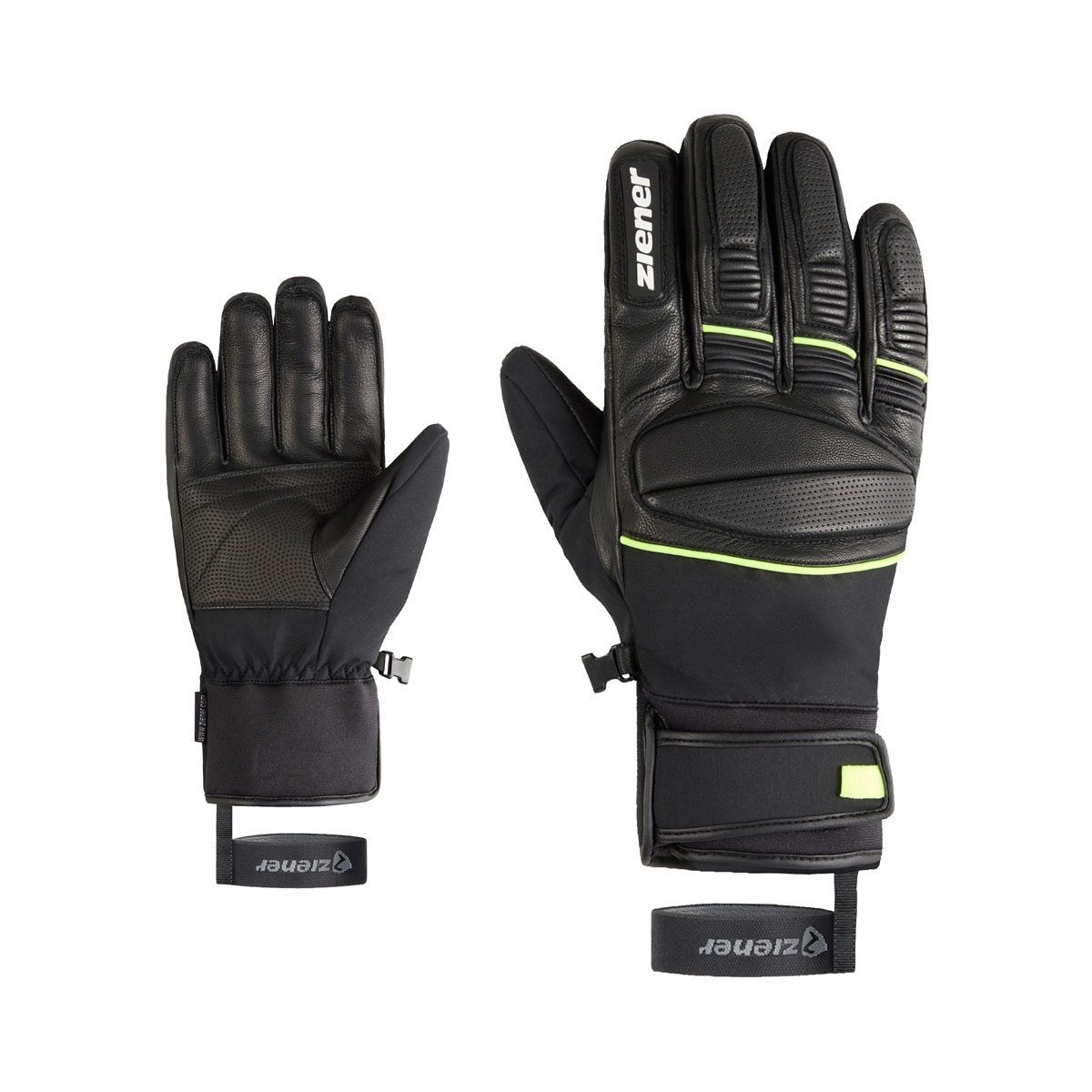 Die sehr sportlichen Ziener Herrenskihandschuhe GOZIM-Z AS® sind mit einer atmungsaktiven, sowie wasser- und winddichten ZIENER AQUASHIELD® Membran ausgestattet. Die griffige Leder Innenhand sorgt für eine perfekte Kraftübertragung am Skistock. Die Fingerknöchnel sind mit einer leichten Polsterung versehen. Das Neoprenbündchen mit Klettverschluß am Handgelenk schließt eng ab, so dass der Handschuh bequem unter dem Jackenärmel getragen werden kann.Die praktische Leash fixiert den Handschuh auch bei schnellem Ausziehen zuverlässig am Handgelenk. Das Produkt enthält nichttextile Teile tierischen Ursprungs. Der Außenstoff ist bluesign® und Standard 100 by OEKO-TEX® zertifiziert.