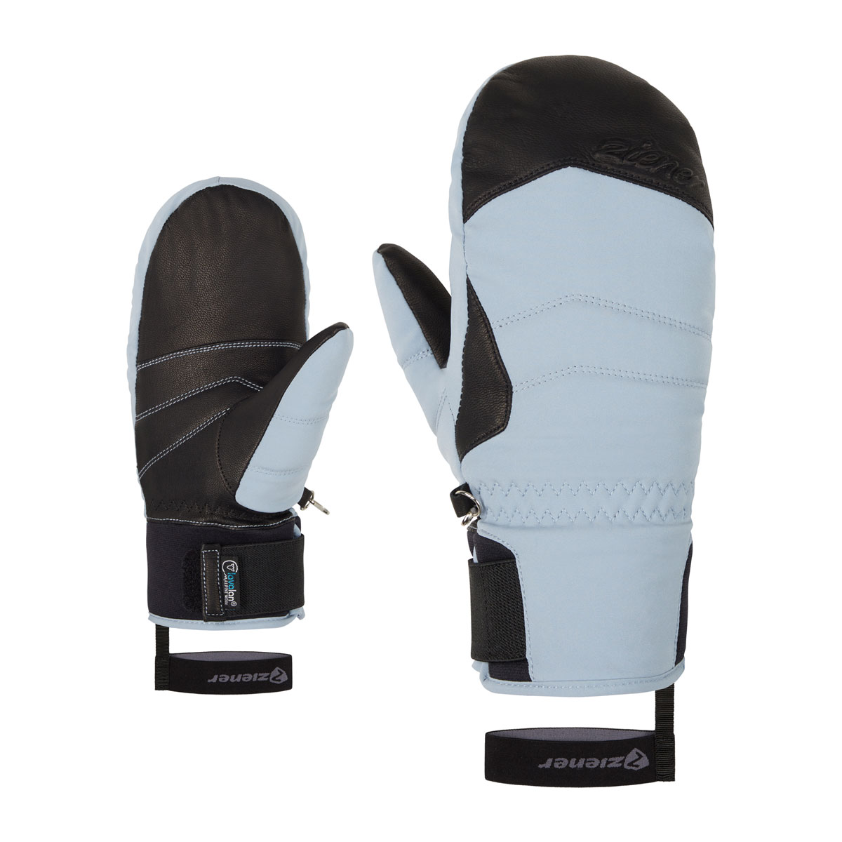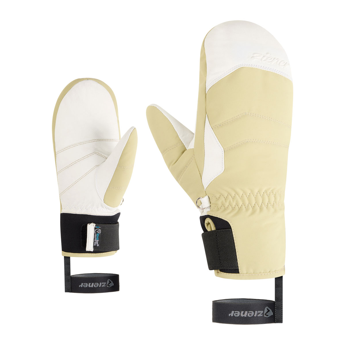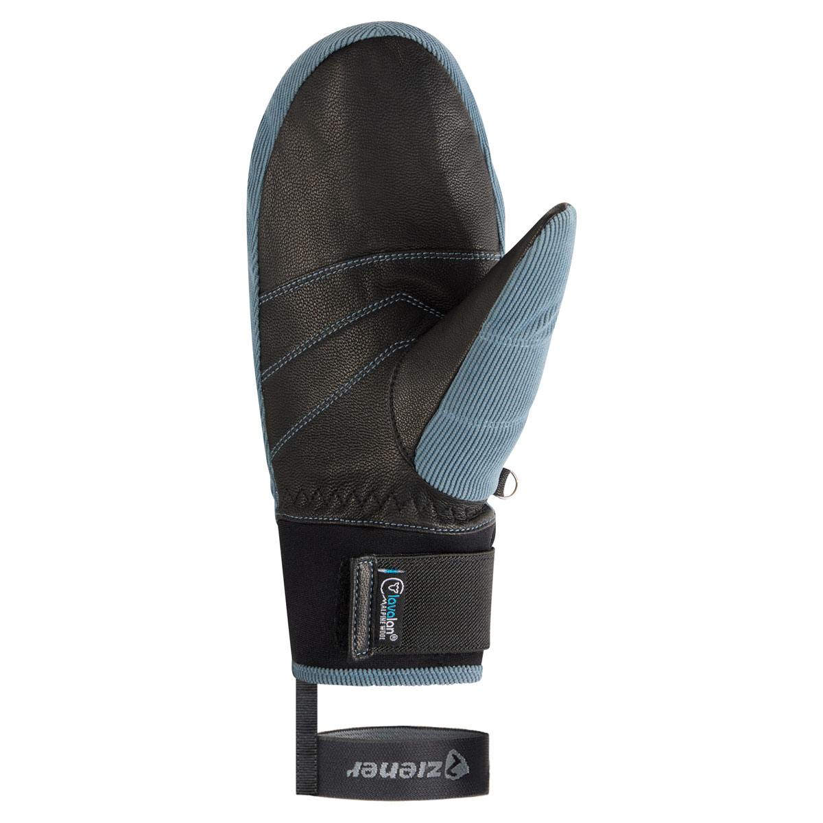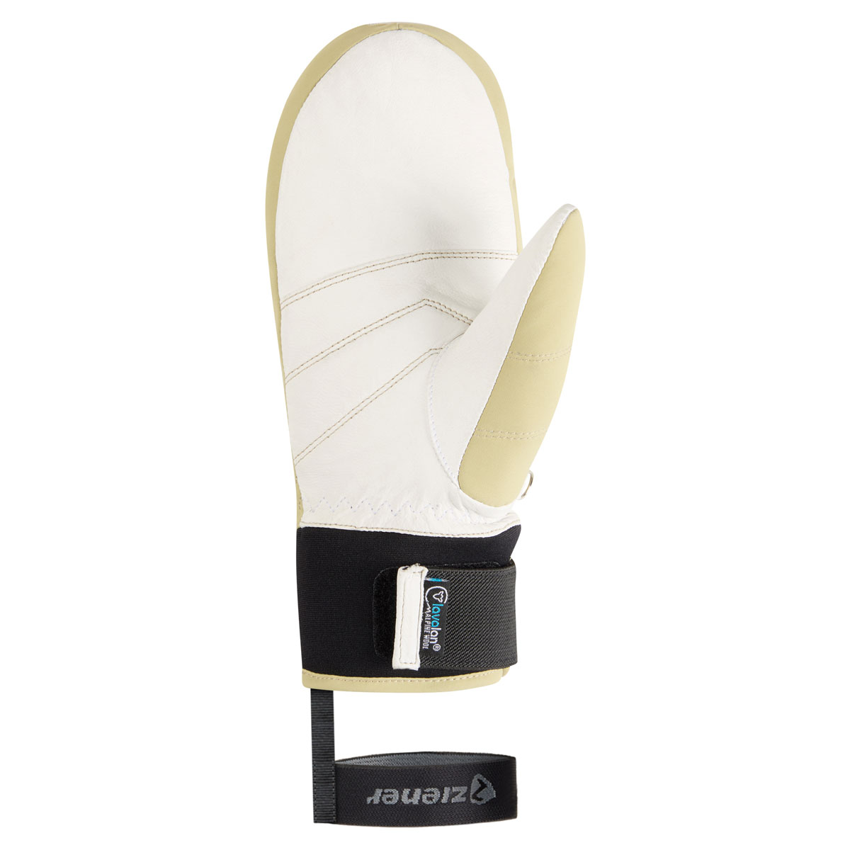 Die extra warmen, freerideorientierten ZIENER Damen Skifäustlinge KALEA-Z AS® AW MITTEN LADY sind mit der wasser- und winddichten ZIENER AQUASHIELD® Membran ausgestattet, die für ein warmes und trockenes Klima sorgt. Die warme und weiche lavalan® Wollwattierung und das Plüschfutter halten die Körpertemperatur stets im Wohlfühlbereich und sorgen für ein angenehmes, wohliges Tragegefühl. Die praktische Leash fixiert den Handschuh auch bei schnellem Ausziehen zuverlässig am Handgelenk. Zudem verleiht die weiche Innenhand aus Ziegenleder ein optimales Griffgefühl. Die Stulpe mit Neoprenbündchen und elastischem Klettverschluss ermöglicht es, die Fäustlinge unter der Jacke zu tragen. Das Produkt enthält nichttextile Teile tierischen Ursprungs.